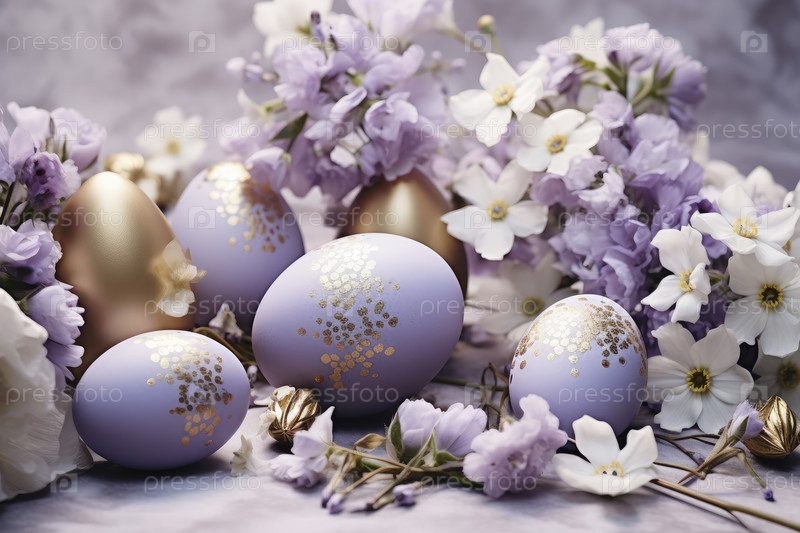 Весенний фон с золотым фиолетовым, сиреневым, пасхальными яйцами и свежими цветами. пространство для копирования, место для текста
