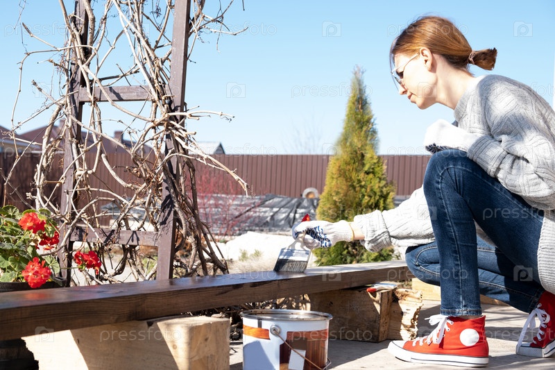 женщина красит доску на улице. Сельская жизнь. Сделай сам