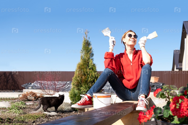 женщина красит доску на улице. Сельская жизнь. Сделай сам