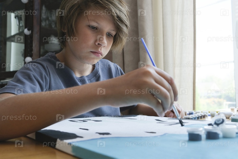 Мальчик с длинными темными волосами рисует картинку по номерам