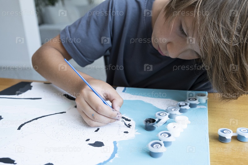 Мальчик с длинными темными волосами рисует картинку по номерам