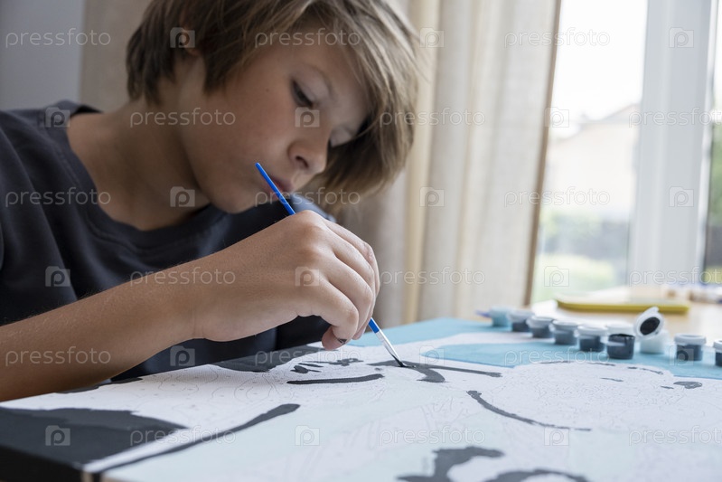 Мальчик с длинными темными волосами рисует картинку по номерам