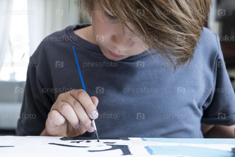 Мальчик с длинными темными волосами рисует картинку по номерам