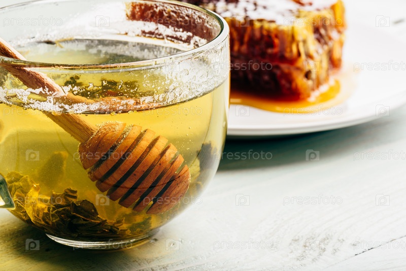 Медовый ковш в чашке зеленого чая