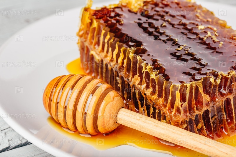 Соты на тарелке с медовым ковшом