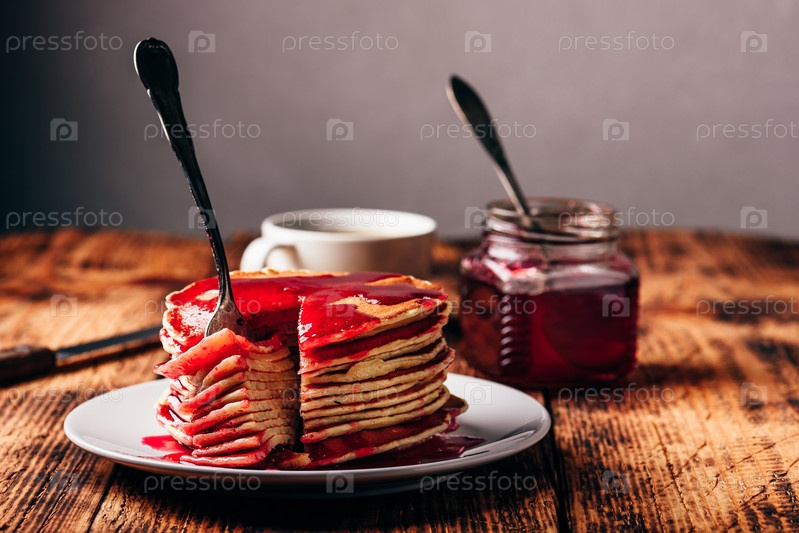 Стопка американских блинов с красным ягодным джемом