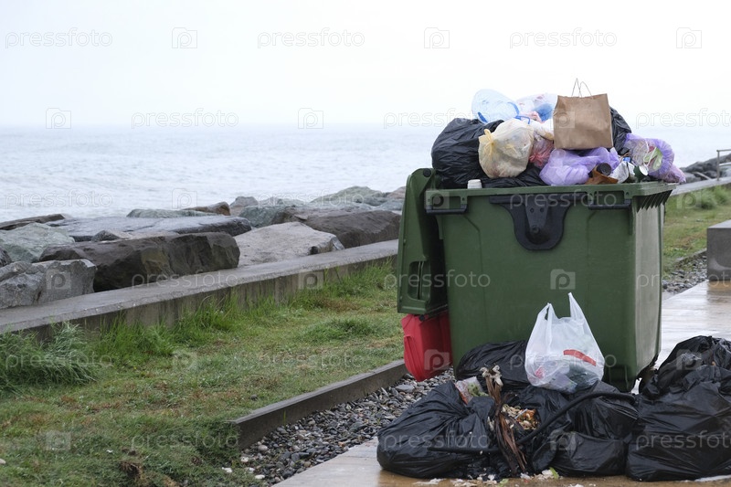 Полные мусорные контейнеры для мусора стоят у моря. Окружающая среда, Экология. сумка Зара