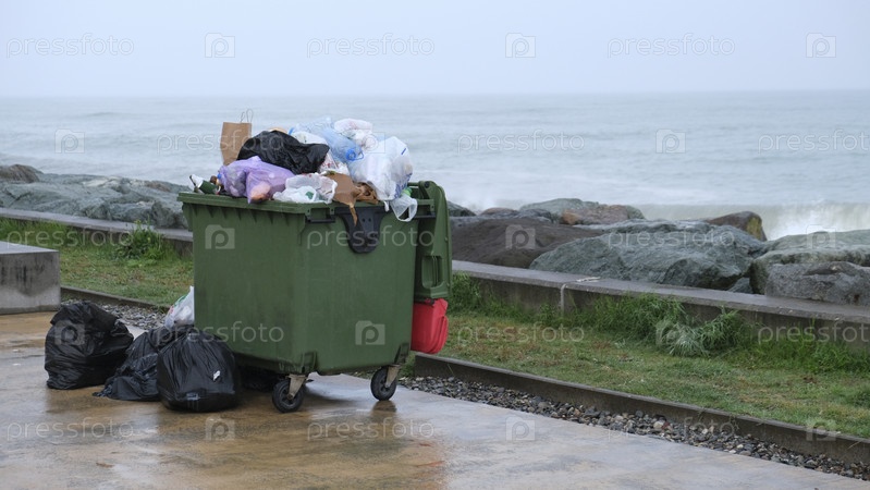 Полные мусорные контейнеры для мусора стоят у моря. Окружающая среда, Экология