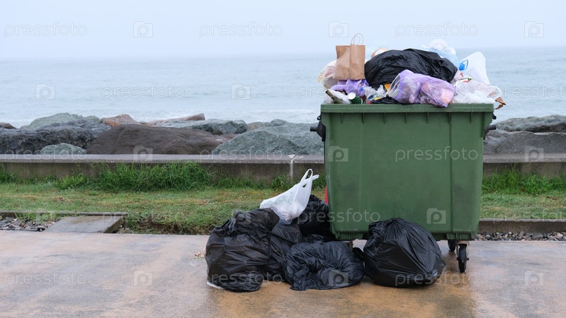 Полные мусорные контейнеры, мусорные контейнеры, стоящие ухо моря. Окружающая среда, Экология