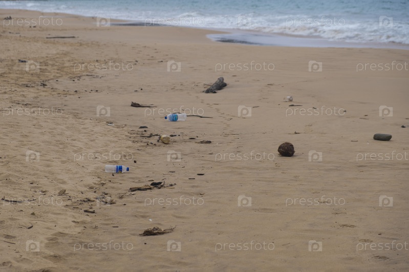 Мусор на пляже, у моря. Загрязнение окружающей среды, экология