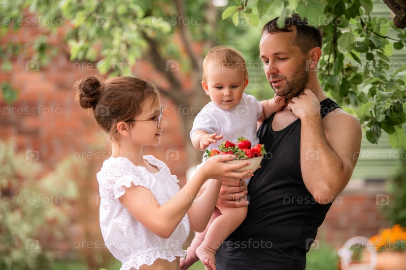 Отец и двое детей держат клубнику в летнем саду на даче. Сцена счастливая и радостная