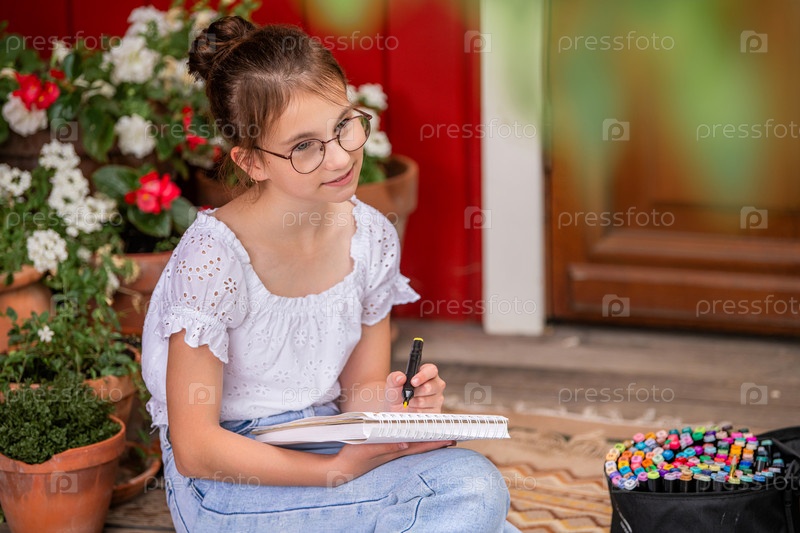 Девушка в очках с удовольствием рисует фломастерами в альбоме на природе, на крыльце загородного коттеджа