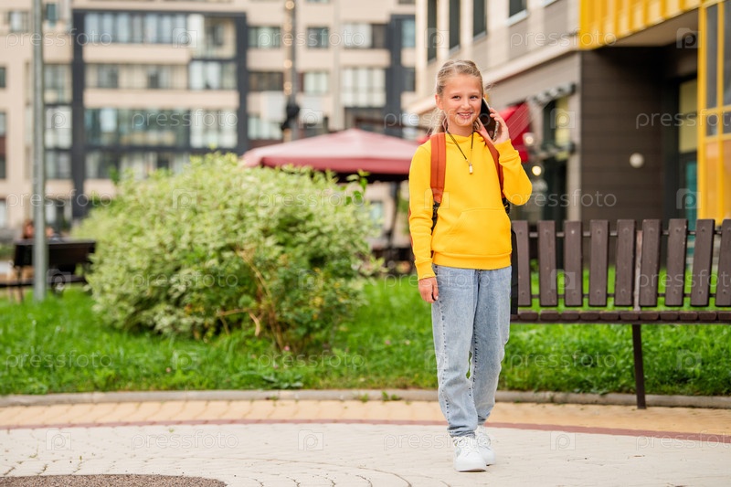 Школьница с рюкзаком идет по улице города и разговаривает по телефону