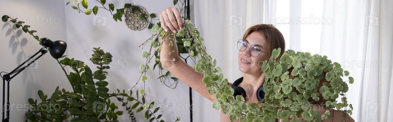 Домашние растения и окружающая среда Молодая женщина пересаживает Glechoma hederacea в домашних условиях. уход за горшечными растениями. ампельное выпадающее растение