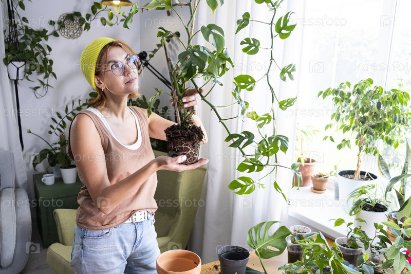 Домашние растения и окружающая среда Молодая женщина пересаживает в домашних условиях Rhaphidophora Tetrasperma, мини-монстр. уход за горшковыми растениями. Корнеплоды