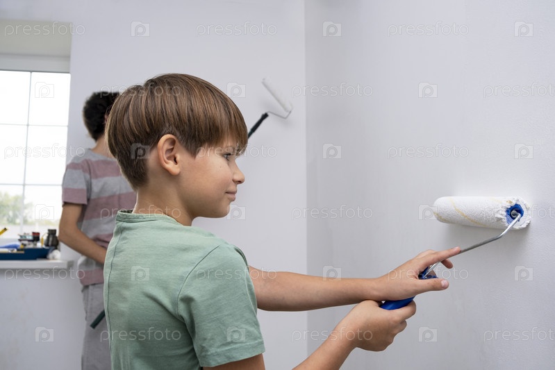Дети красят стену валиком. подростки проводят время вместе, помогая делать ремонт