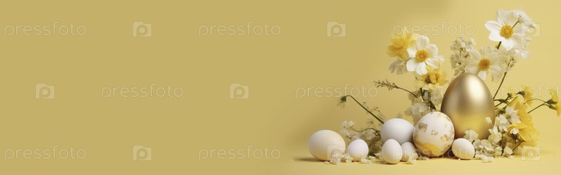 Баннер. Весенний фон с золотисто-желтыми пасхальными яйцами и свежими цветами. пространство для копирования, место для текста