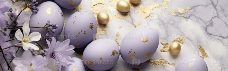 Баннер. Весенний фон с золотыми фиолетовыми пасхальными яйцами и свежими цветами. пространство для копирования, место для текста