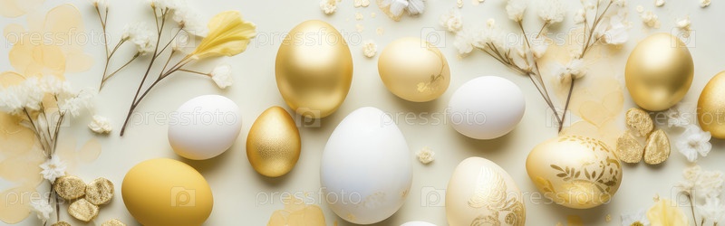 Весенний фон с золотисто-желтыми пасхальными яйцами и свежими цветами. пространство для копирования, место для текста. баннер