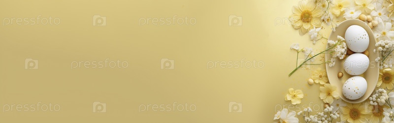 Весенний фон с золотисто-желтыми пасхальными яйцами и свежими цветами. пространство для копирования, место для текста. баннер