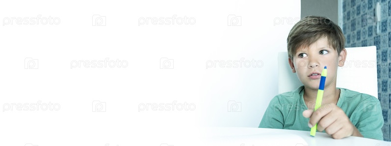 Баннер. Улыбающийся мальчик с учебником делает домашнее задание. Обратно в школу. счастливый школьник. Дистанционное обучение