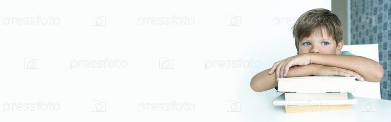Баннер. Грустный мальчик с учебником делает домашнее задание. Обратно в школу. счастливый школьник. Дистанционное обучение