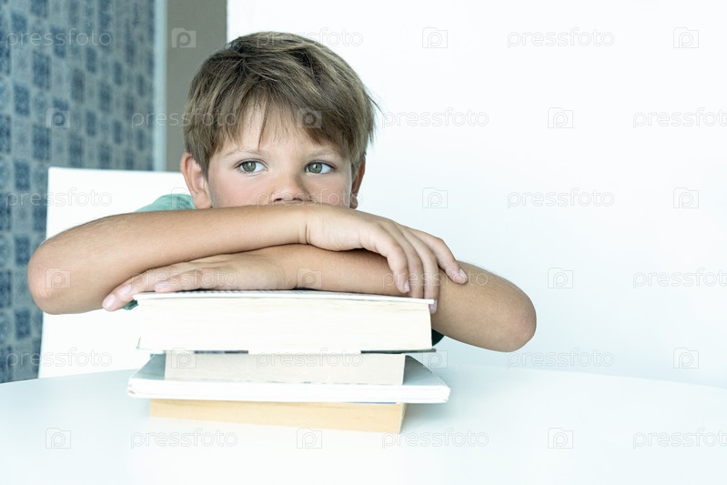 Грустный мальчик с книгой делает домашнее задание. Обратно в школу. Несчастный школьник с учебниками. Дистанционное обучение