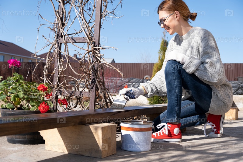 Настоящая женщина красит доску на улице. Сельская жизнь. Сделай сам