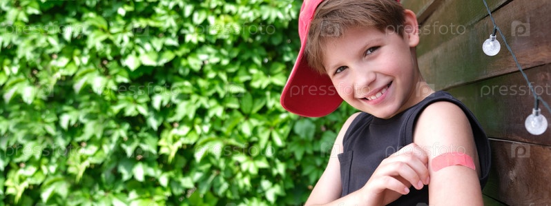 Мальчику сделали прививку от коронавирусной инфекции. Вакцинация против ковид-19. Баннер. Копирование пространства