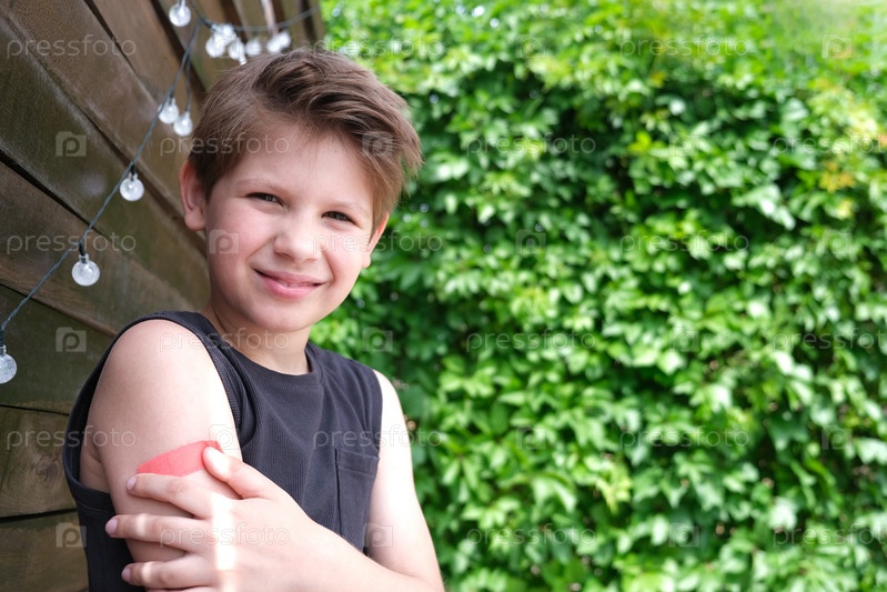 Милый мальчик вакцинирован от коронавирусной инфекции. Вакцинация против ковид-19. Спутник-В. Копировать пространство