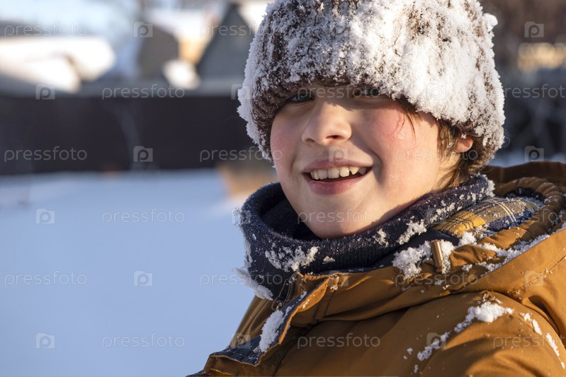 Портрет милого подростка, подростка, играющего в снегу, в заснеженной шляпе на зимней природе