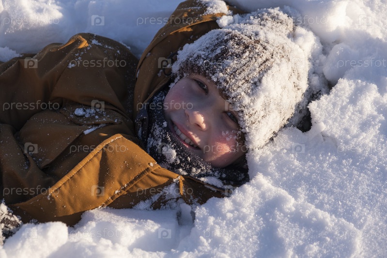 Портрет милого подростка, играющего в снегу, в заснеженной шляпе на зимней природе