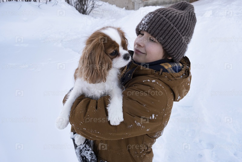 Мальчик-подросток с домашним животным веселится со снегом. Милый щенок зимой. Кавалер-кинг-чарльз-спаниель