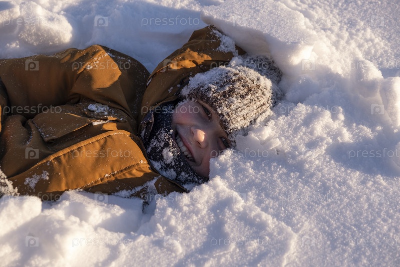 Портрет милого подростка, лежащего в снегу, в заснеженной шляпе на зимней природе