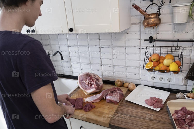 Настоящие мужчины режут свежее сырое мясо на борту белой кухни. Подготовка свинины, приготовление