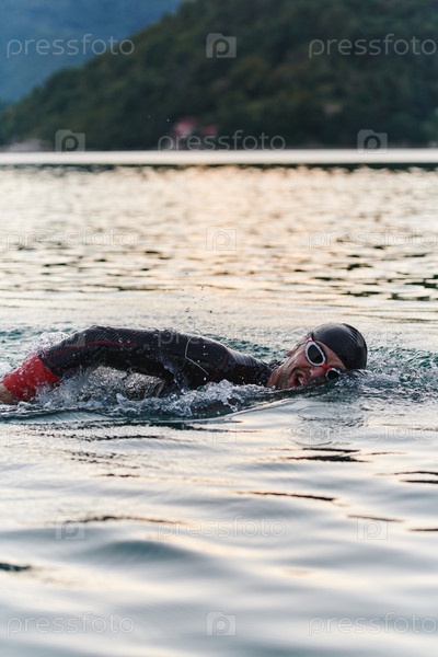 Профессиональный триатлонист с непоколебимой преданностью тренируется перед предстоящими соревнованиями на озере, излучая чувство атлетизма и глубокое стремление к совершенству
