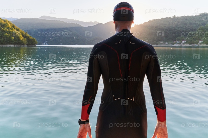 Настоящий спортсмен по триатлону готовится к тренировке по плаванию на озере
