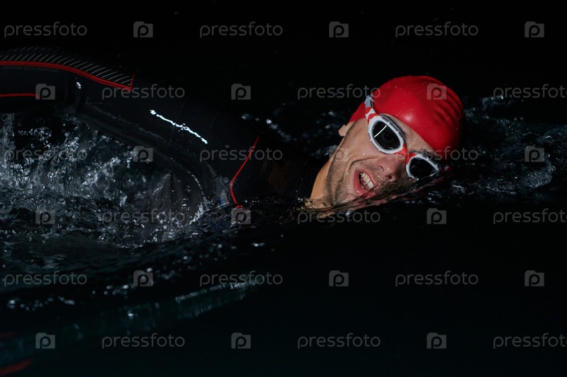 Решительный профессиональный триатлонист проходит тщательную ночную тренировку в холодной воде, демонстрируя преданность делу и стойкость в подготовке к предстоящим соревнованиям по триатлону по плаванию