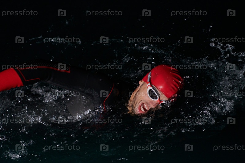 Решительный профессиональный триатлонист проходит тщательную ночную тренировку в холодной воде, демонстрируя преданность делу и стойкость в подготовке к предстоящим соревнованиям по триатлону по плаванию