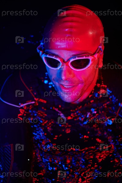 Настоящий пловец-триатлет, отдыхающий во время тяжелых тренировок при ночном неоновом гелевом свете