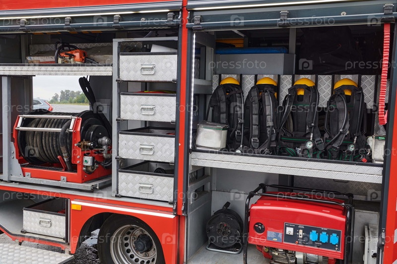 Крупный план основного противопожарного оборудования на современной пожарной машине, демонстрация инструментов и снаряжения, готовых к экстренному реагированию на опасные пожарные ситуации