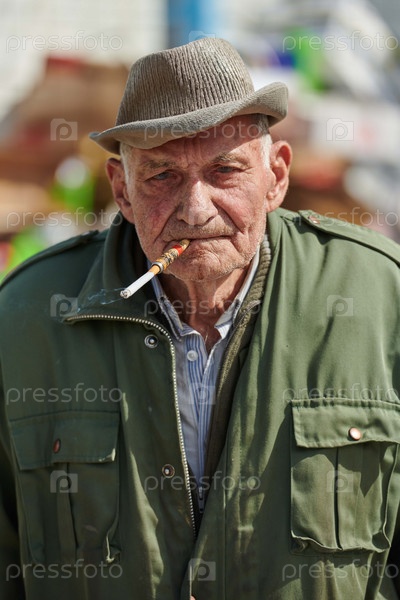 Пожилой мужчина курит сигарету в темно-зеленой куртке и кепке