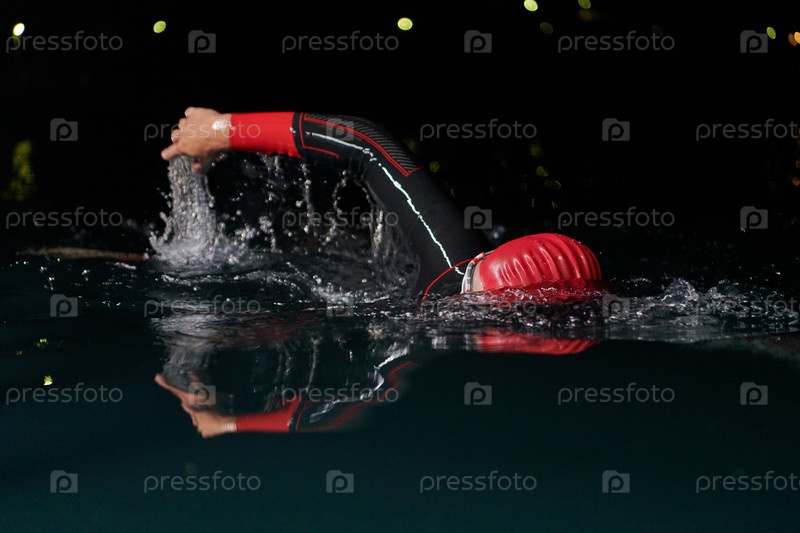 Решительный профессиональный триатлонист проходит тщательную ночную тренировку в холодной воде, демонстрируя преданность делу и стойкость в подготовке к предстоящим соревнованиям по триатлону по плаванию