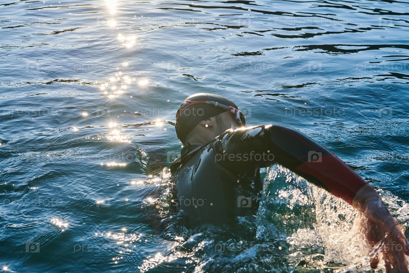 Спортсмен по триатлону плавает на озере на рассвете в гидрокостюме