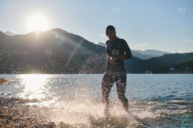 Спортсмен по триатлону начинает тренировку по плаванию на озере