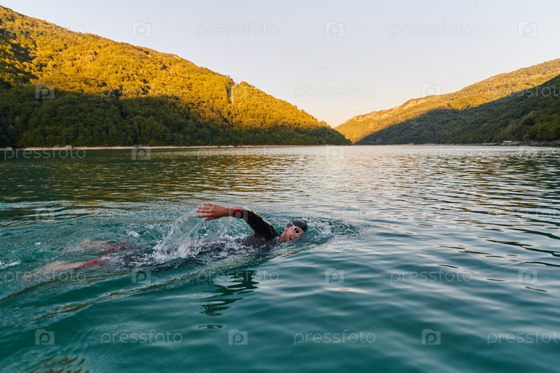 Спортсмен по триатлону плавает на озере на рассвете в гидрокостюме