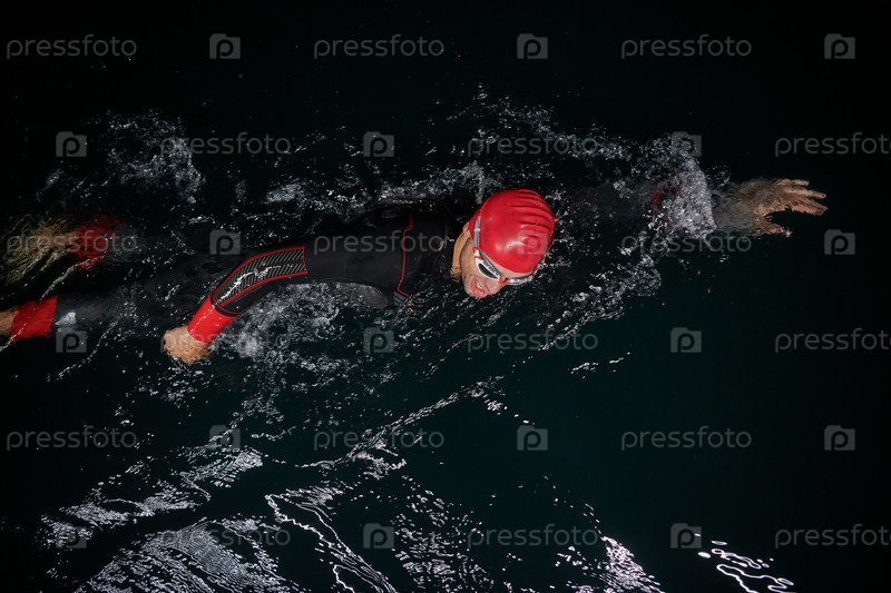 Решительный профессиональный триатлонист проходит тщательную ночную тренировку в холодной воде, демонстрируя преданность делу и стойкость в подготовке к предстоящим соревнованиям по триатлону по плаванию