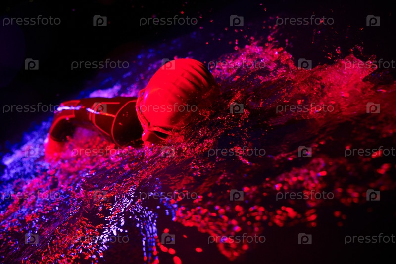 Настоящий пловец-триатлет, отдыхающий во время тяжелых тренировок при ночном неоновом гелевом свете