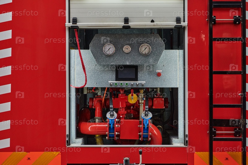 Крупный план основного противопожарного оборудования на современной пожарной машине, демонстрация инструментов и снаряжения, готовых к экстренному реагированию на опасные пожарные ситуации