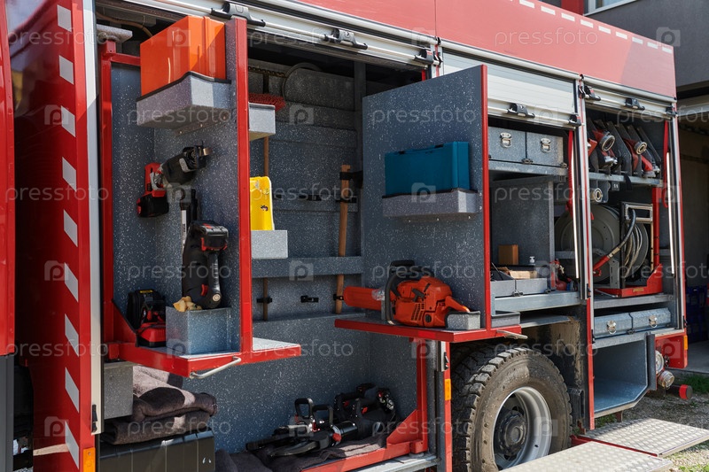 Крупный план основного противопожарного оборудования на современной пожарной машине, демонстрация инструментов и снаряжения, готовых к экстренному реагированию на опасные пожарные ситуации